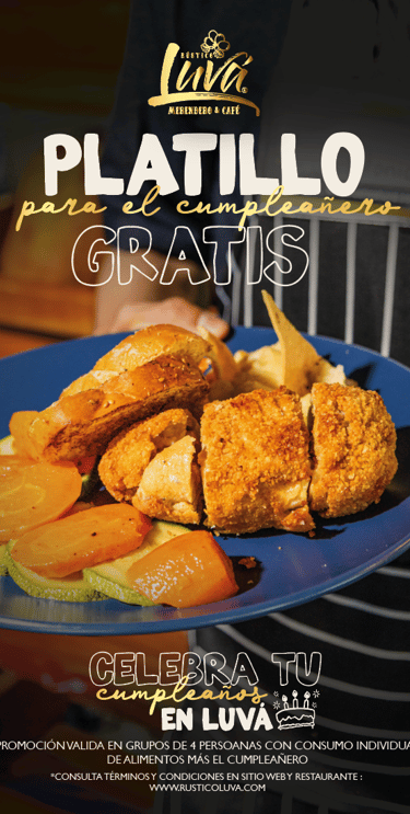 En Rústico Luvá queremos celebrar contigo. Si es tu cumpleaños y vienes acompañado de cuatro personas que realicen consumo individual de alimentos (un platillo por persona), ¡tu platillo es completamente gratis!